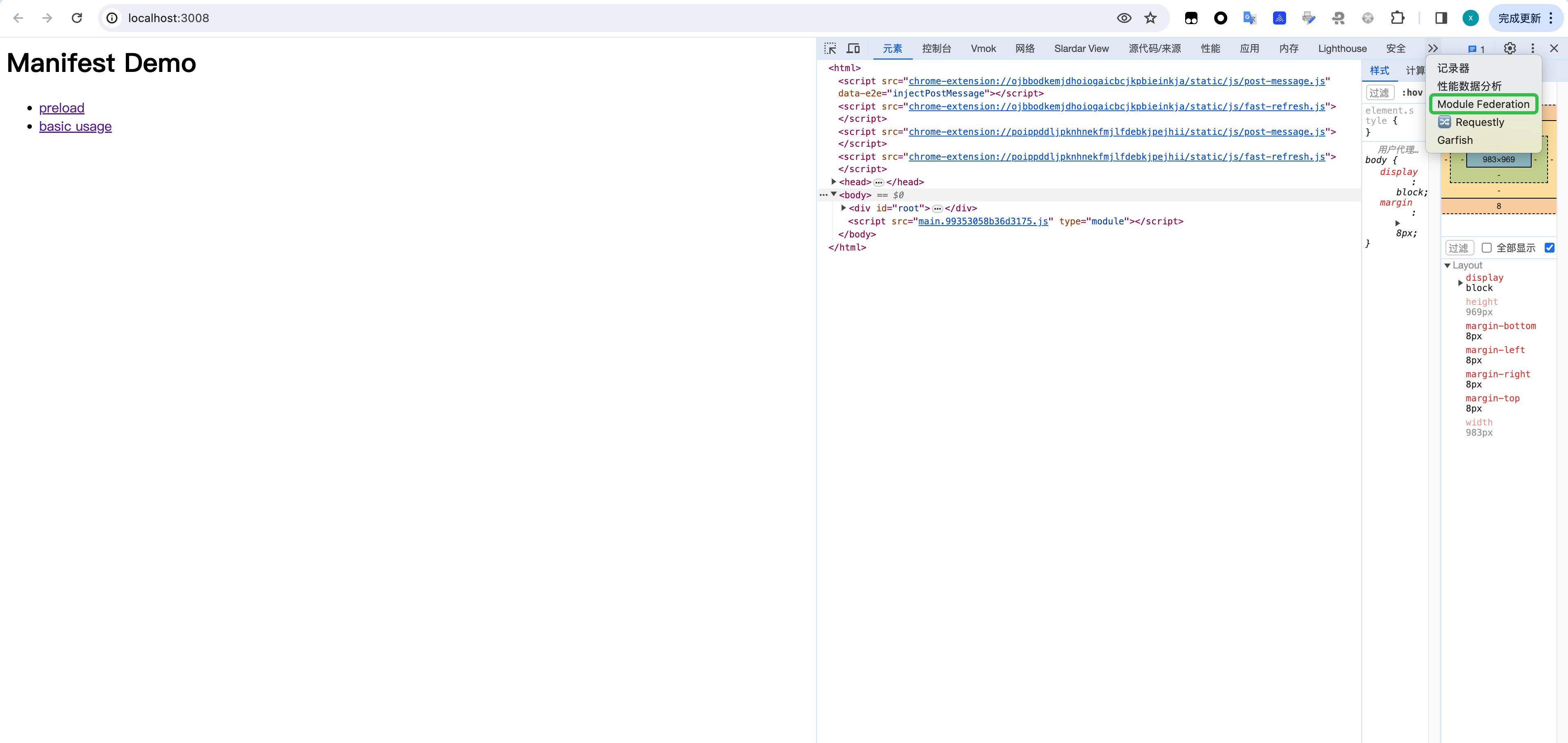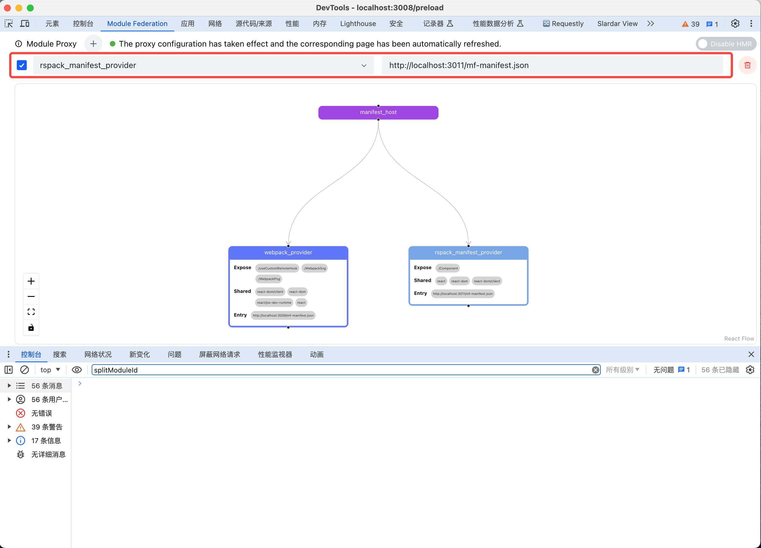 Module Federation proxy functionality, which proxies the Module Federation on the online page to the user's local Module Federation.Module Federation on the online page for rapid feature verification.You must use mf-manifest.json to utilize the visualization and proxy capabilities provided by Chrome DevTools.